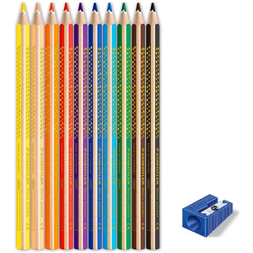 Jumbo sized colouring pencil in triangular design, with name field. Specially designed for small hands. 4mm diameter lead. Includes free pencil sharpener.