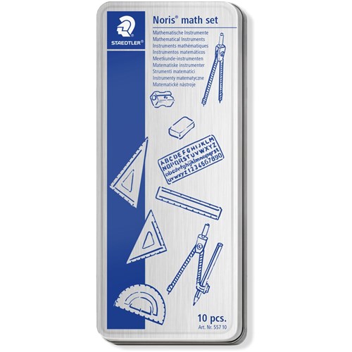 Contains ruler, protractor, set squares, sharpener, eraser, pencil, compass, dividers and lettering guide. Packed in a sturdy metal storage case.