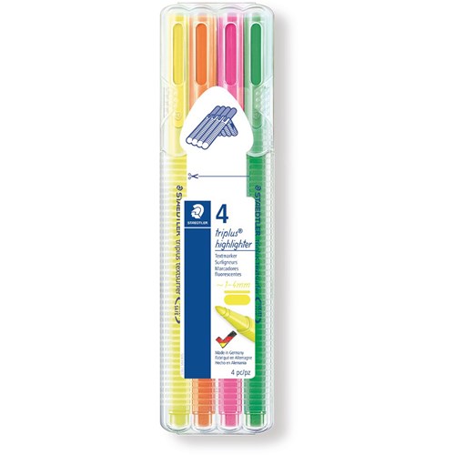 Neon Highlighter with soft variable tip for very fine to broad highlighting in 4 strong colours Ergonomic triangular barrel for effortless,fatigue-free highlighting Lightfast, water based neon ink For paper, fax and carbon copies With clip and PP barrel guarantees long service life Variable line width from approximately 1-4mm Stand up STAEDTLER wallet converts to convenient desk stand