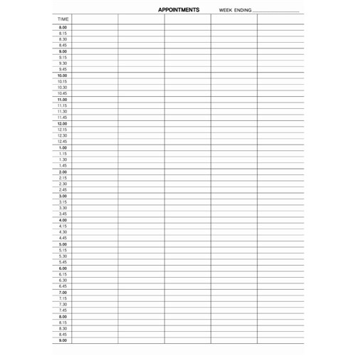 Blue, case bound cover with 192 section sewn pages. 1/4 hour appointment times from 8am to 9pm for up to 10 operators. Suitable for professional offices, doctor's surgeries, hairdressers etc.